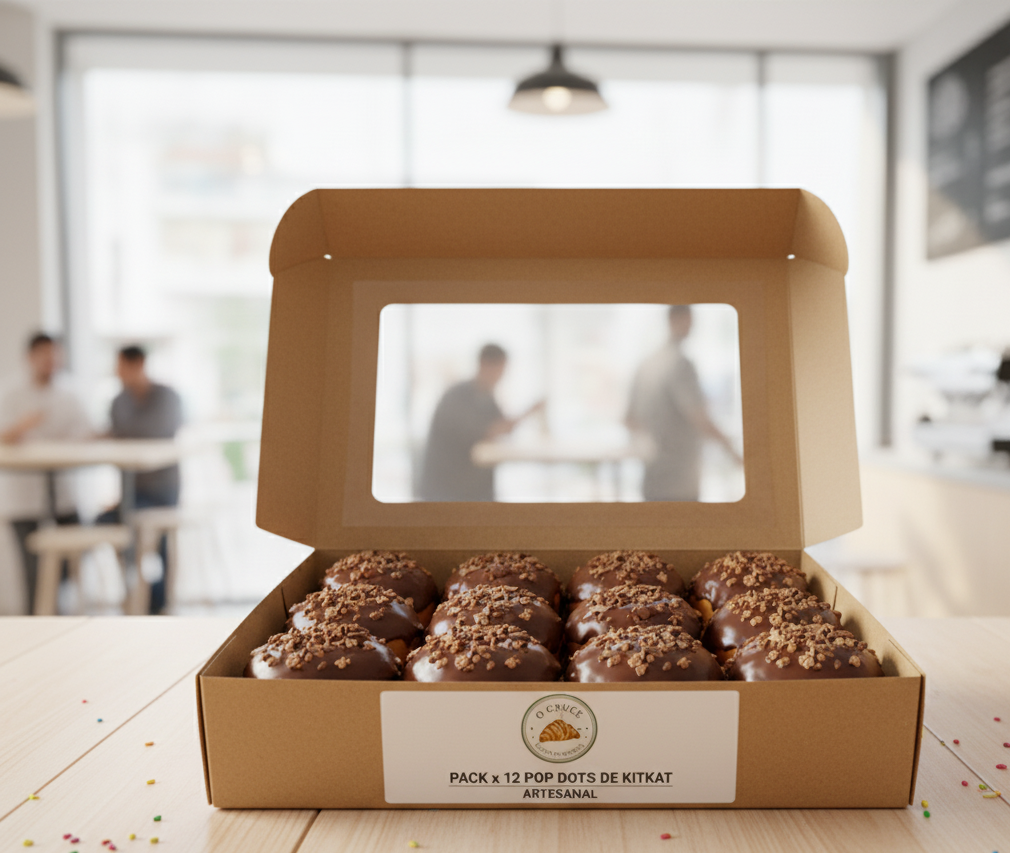 12 donuts esponjosos elaborados al estilo Ocruce, bañados en cobertura de chocolate con leche y decorados con trozos de KitKat crujientes.