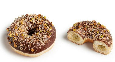 Este pack incluye 6 mini donuts premium bañados en una fina capa de glaseado dorado con sabor a vainilla oriental y decorados con virutas de pistacho.